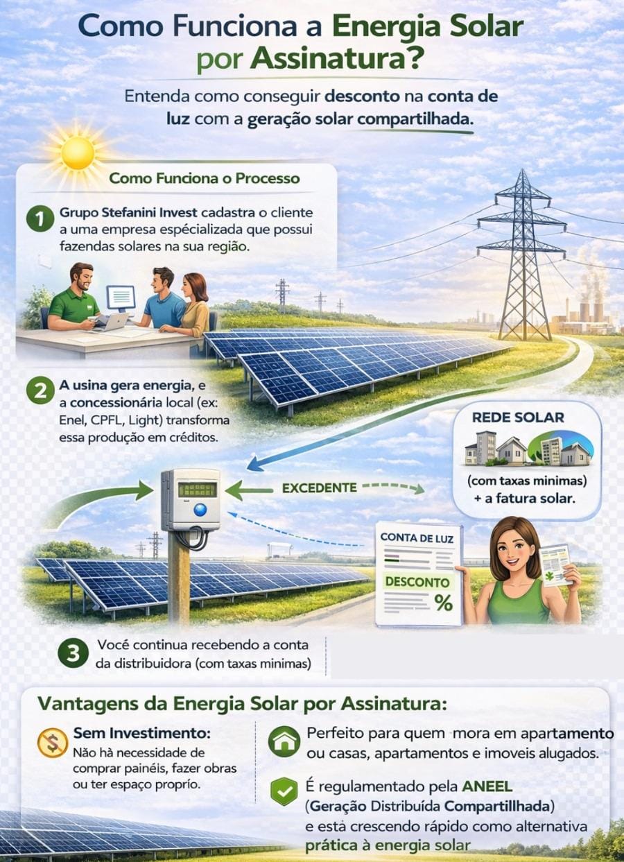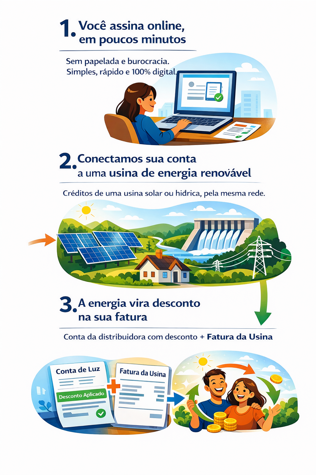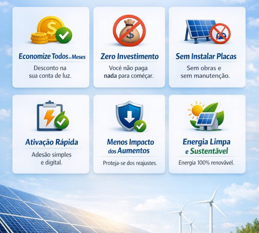 Receba créditos de energia solar direto na sua fatura e pague menos todo mês.