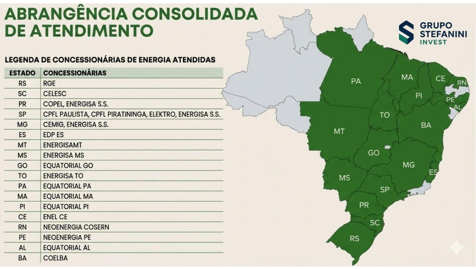 Trabalhamos em parceria estratégica com as principais usinas e concessionárias do país. Nossa operação hoje abrange 18 estados brasileiros, integrando a rede de gigantes como CPFL, Energisa, Equatorial, Neoenergia e Cemig. Ter uma ampla rede de distribuição nos permite oferecer soluções robustas e confiáveis em quase todo o território nacional.